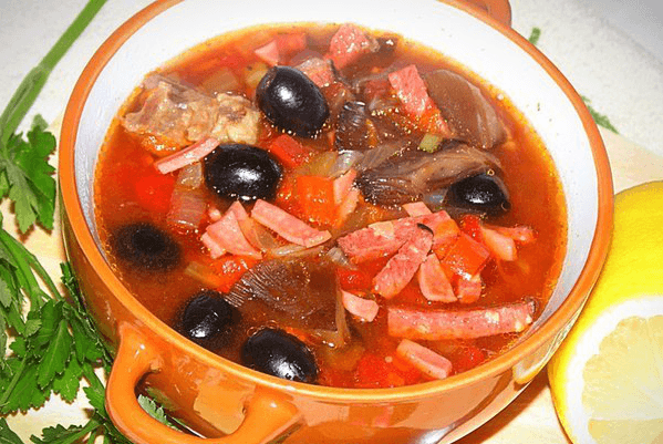 Переложить зажарку в говяжий бульон, и добавить нарезанные огурцы и оливки, довести до кипения, выключить и дать солянке настоятся минут 20.