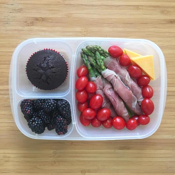 Твердый сыр, помидоры Черри, ветчина и спаржевая фасоль, мафин, ежевика.