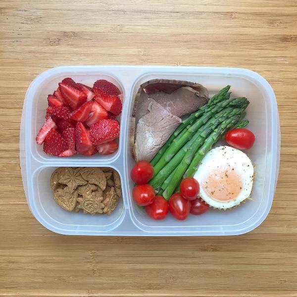 Буженина, спаржевая фасоль, помидоры Черри, яйцо-глазунья, клубника, злаковое печенье