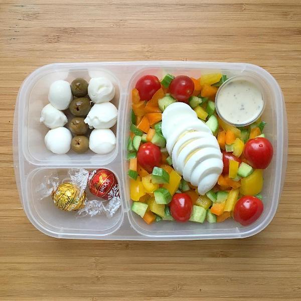 Салат из свежих овощей, отварное яйцо, соус на онове йогурта, оливки и моцарелла, конфетки из темного шоколада