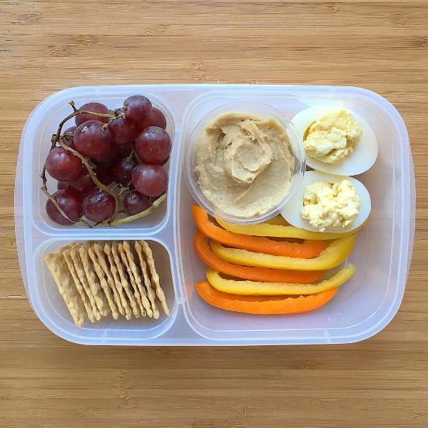 Хумус, яйца, болдгарский перец, виноград, печенье с кунжутом и злаками