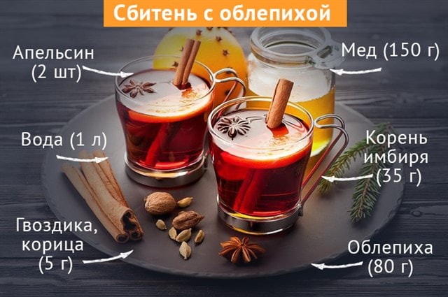 Облепиху отварите в кипящей воде в течение 15 минут. Как только появится пена, снимите емкость с плиты. Хорошенько процедите отвар и дождитесь, пока он немного остынет.В отдельной емкости вскипятите воду. Добавьте мед и размешивайте его до полного растворения. Добавьте предварительно мелко порезанный имбирь. Туда же отправьте гвоздику, корицу и порезанные на кружочки апельсины. Все кипятите 10 минут.Оставьте напиток на 30 минут для остывания. А потом процедите его. В практически готовый сбитень добавьте облепиховый отвар. Все тщательно перемешайте.