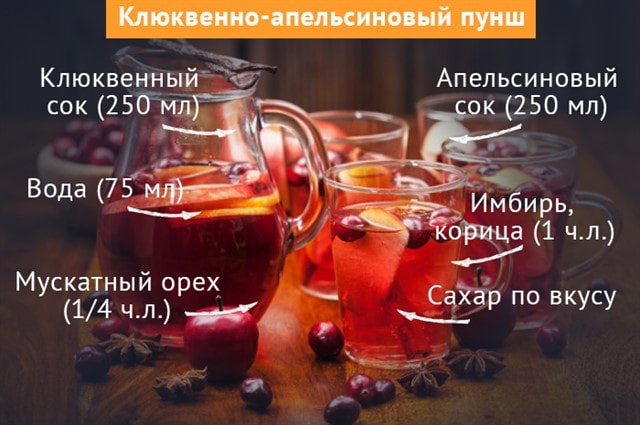 В емкости соединить клюквенный и апельсиновый соки. Добавить воду, сахар и специи. Перемешать и прогреть, не доводя до кипения, в течение 5–10 минут. Сахар должен полностью раствориться.Снять с плиты. Перелить в подогретый кувшин для пунша. Украсить ломтиками лимона и апельсина. Подавать пунш горячим.