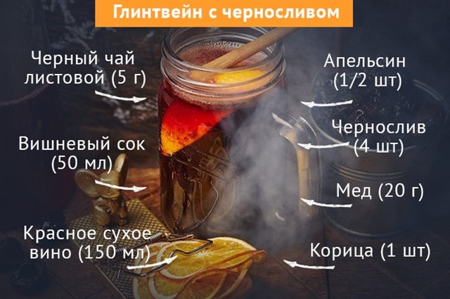 Черный чай залить вишневым соком и нагреть, не доводя до кипения. Дать настояться 5–7 минут. Добавить красное вино, мед, корицу, нарезанный апельсин и чернослив и нагреть, не доводя до кипения. Дать смеси настояться 10–15 минут.