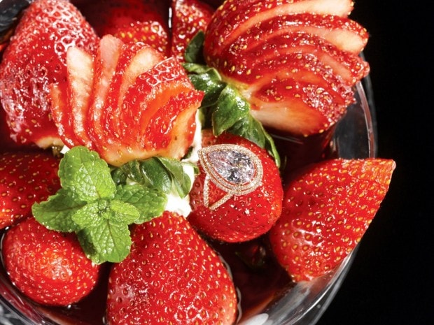 Чем обусловлена такая высокая цена? Среди ягод клубники спрятано удивительной красоты золотое кольцо с большим розовым бриллиантом (4,7 карат). Ранее оно принадлежало самому Эрнесту Касселю – советнику английской королевы. Вместе с клубничным десертом подаётся винный набор стоимостью в 25 тысяч долларов. Выносится это чудо под аккомпанемент живой музыки.