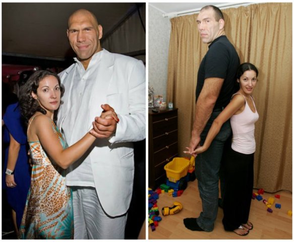 Российский «коллега» Владимира Кличко бывший боксер-супертяжеловес Николай Валуев также связал свою жизнь с миниатюрной дамой. Рост его супруги Галины – 163 сантиметра. Рядом с 213-сантиметровым Николаем, коего нередко называют «русским гигантом», женщина выглядит Дюймовочкой. Впрочем, оцените сами.