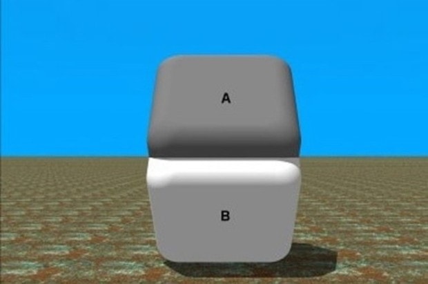 Скажите, какие цвета имеют квадраты А и Б? Серый и белый? А теперь закройте пальцем зону их соприкосновения. Теперь вы увидите, что они оба имеют одинаковый цвет, серый.