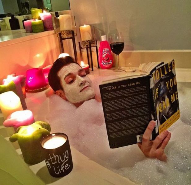 «Мои любимые свечи, книжка, масочка для лица из глины и пузырьки-пузырьки…»