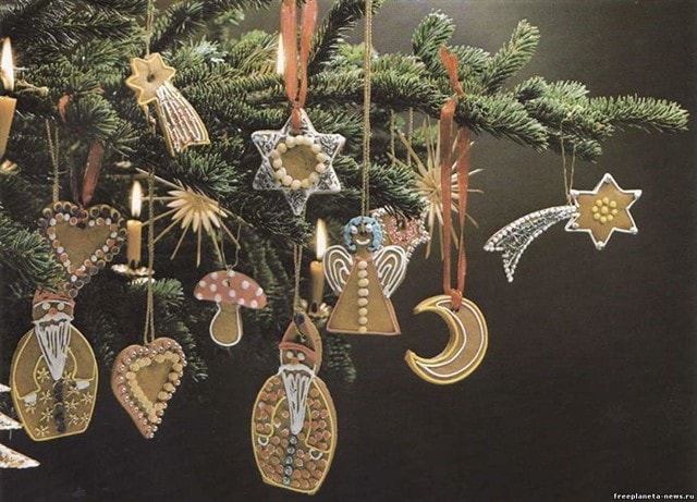 В старые добрые времена все елочные украшения были символичными, каждое из которых несло глубокий смысл с религиозной подоплекой. Так, казалось бы, сладкие вафли – всего лишь вкусное угощение, но они, развешанные на ветвях зеленой елочки, являлись напоминанием о пресных хлебах, которые церковь во все времена использовала для причастия. До середины XVIII столетия елка украшалась только съедобными «украшениями» — яблоками, вафлями, орехами в золотых бумажках, другими фруктами и сладостями, пастилой и медовыми пряниками. И только, начиная со второй половины XVIII столетия, появляются первые «несъедобные» елочные украшения. На этом этапе они еще были примитивными, в каждой семье они изготавливались своими руками из бумаги, яичной скорлупы и еловых шишек, покрытых напылением. Вскоре появляются и первые игрушки, изготовленные мастерами, это были замысловатые фигурки из латуни и чеканки, изображающие, главным образом, сказочных фей и невинных ангелочков.
