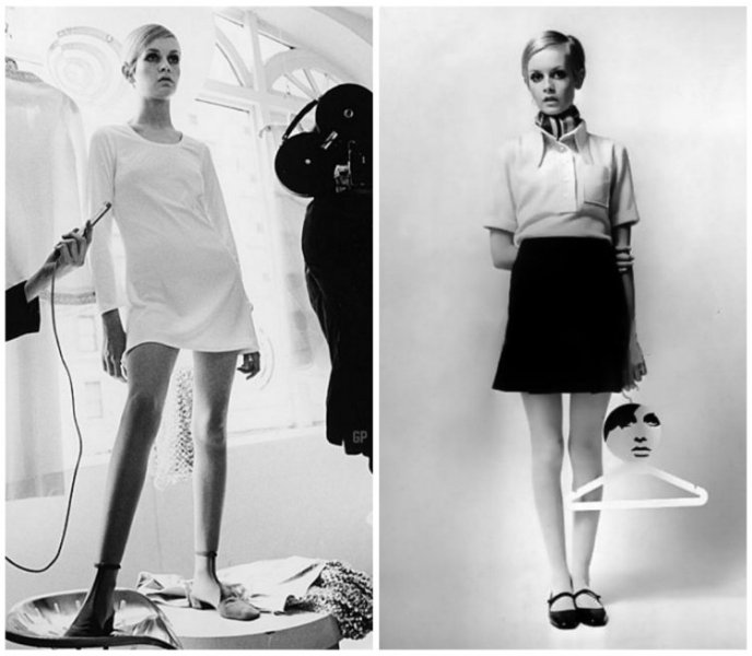 Сексуальная революция 60-х внесла значительные коррективы в общественное восприятие женской красоты. На смену пышнoгрудым красоткам с широкими бедрами пришли андрогинные девушки с плоской грудью. А еще стараниями супемодели Лесли Хорнби (на фото) по прозвищу Твигги в моду вошли короткие платья и миниюбки. Девушек, стремящихся быть похожими на Лесли (а таких было подавляющее большинство), стали называть Твигги.